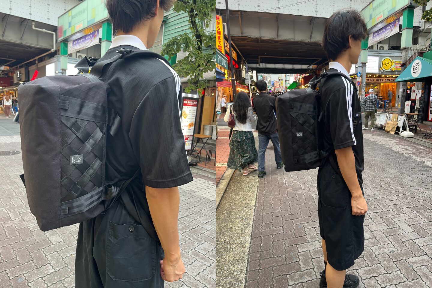 Also using a single strap, this setup keeps the bag close to your body — great for cycling commutes. You can also swap in CHROME’s signature seatbelt buckle for a more authentic messenger look!